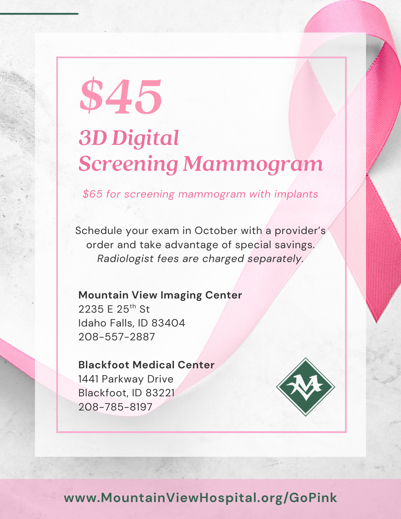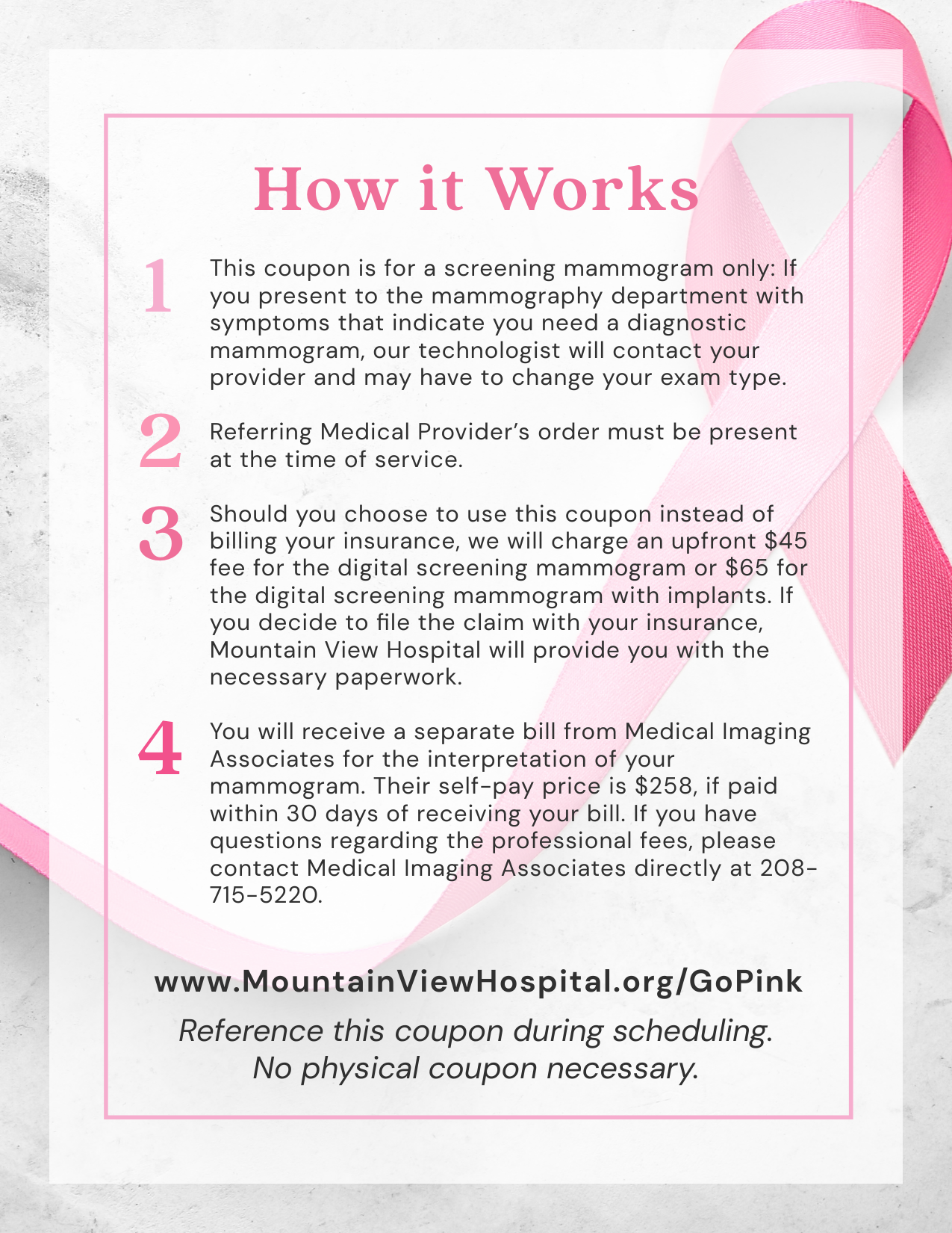 2. Should you choose to use this coupon instead of billing your insurance. We will charge an upfront $45 fee for the digital mammogram screening or $65 for the digital mammogram screening with implants. If you decide to file the claim with your insurance, Mountain View Hospital will provide you with the necessary paperwork.