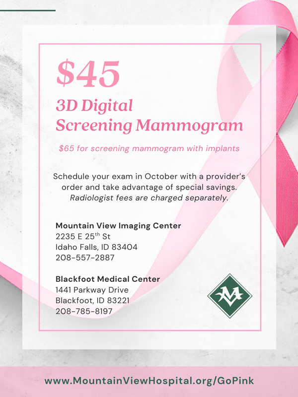 Mountain View Hospital has been proactive in the fight against breast cancer here in Eastern Idaho since our inception. We believe that education, awareness, and generosity to women and men of this area about breast cancer greatly increase survival and odds of beating breast cancer. Through the years we have passed out thousands of mammogram coupons.